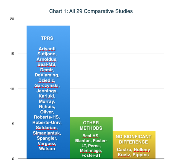 - 3 reported statistically significant positive results for TPRS over another method, but I did not have access to enough data in the article to verify the standard deviation or p value.