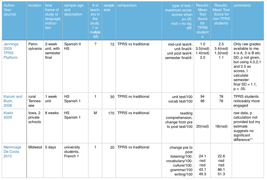 So where does one find the research papers comparing TPRS to other teaching methods? There is a website, tprsacademy.com, that lists about 70 TPRS research papers, including a bunch of comparative studies. But with ‘tprs’ right there in the name, one might think it’s a biased website. So I went straight to the horse’s mouth. Using my own library card, and my kids’ university library cards, I searched every database I could find - JSTOR, Proquest, ERIC, WorldCat and good old Google. Guess what? I found 27 comparative studies, and 24 of those studies were already on the tprsacademy.com website. So take it from me, tprsacademy.com is doing an honest and thorough job of compiling the TPRS research.