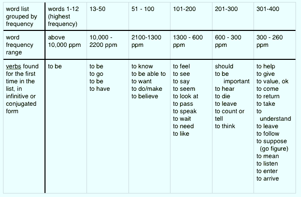 This table is not perfect, but it gives you a general idea of what is going on with word frequency. Here is how to read the table: The fact that ser is in the first column means that some form of ser (it happens to be es) is in the top 12 most frequent words and has an actual frequency of more than 10,000 ppm in this corpus. Other forms of ser crop up fairly soon in the list (For example era is #73) but only the first form, es, is recorded in my table. Another example: the most frequently occurring form of ir (happens to be vamos) is between #13 and #50 on the frequency list and occurs with a frequency between 2200 and 10,000 ppm.
